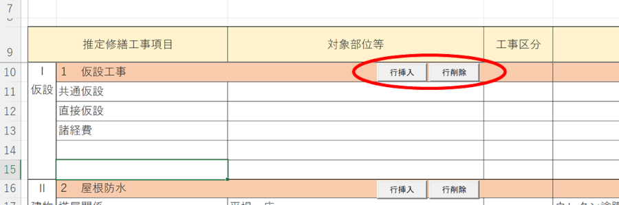 「行挿入」ボタンで表の書式を壊さず空白行を一行挿入できます |